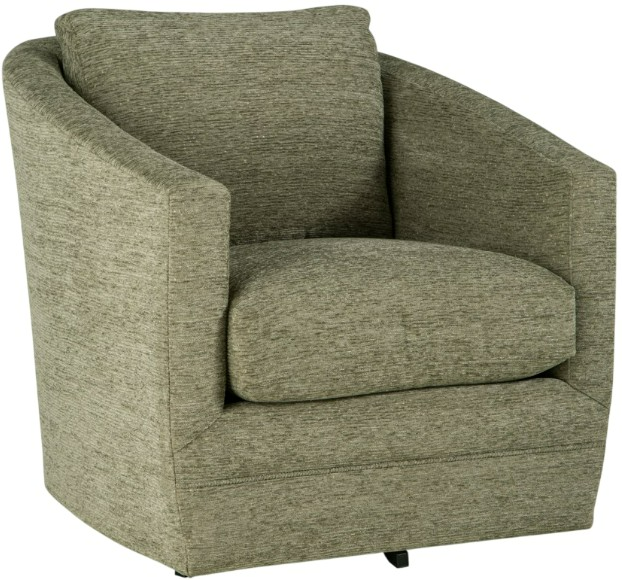 A modern barrel-back shape gives this comfy swivel chair a clean sophisticated look. It features track arms and an attached back pillow for easy maintenance. Also available as a swivel glider, style number 063610SG.Read More