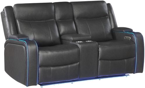 Enhance your relaxation with the UM2768 Power Reclining Console Loveseat. This stylish piece features built-in cupholders, storage, and Global surround sound speakers for an immersive experience, making it perfect for movie nights. Upholstered in charcoal faux leather, it includes USB connectivity for convenience. LED accent lighting and overstuffed cushions complete this loveseat, offering both functionality and comfort.Read More