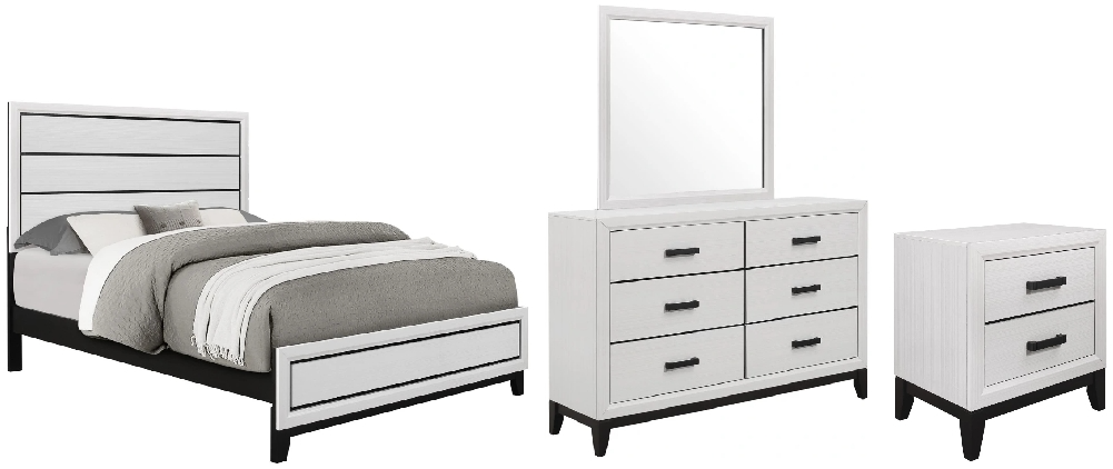 Includes: (1) queen bed, (1) dresser, (1) mirror and (1) nightstand