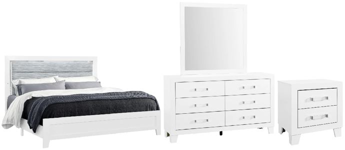 Includes: (1) king bed, (1) dresser, (1) mirror, and (1) nightstand