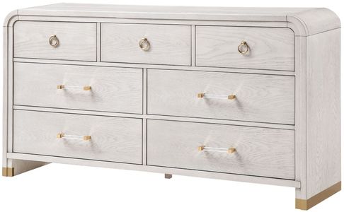 Sophisticated design meets everyday functionality in the Malmo Dresser. Finished in a light beige oak veneer with rounded edges, it features seven spacious drawers, including velvet-lined top drawers ideal for storing jewelry or delicate items. Gold-accented acrylic handles and gold-trimmed legs add a glamorous touch, making this dresser a perfect balance of luxury and practicality.Read More