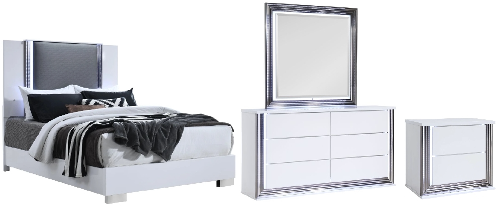 Includes: (1) queen bed, (1) dresser, (1) mirror, and (1) nightstand