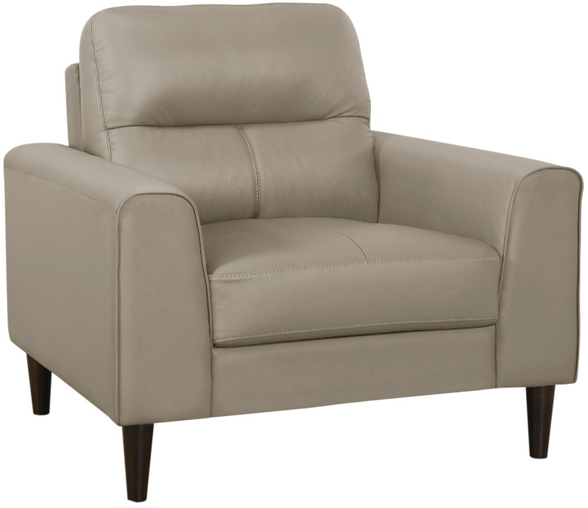 Modern comfort is paired with retro lines to create the design of the Lewes Collection. Covering the chair is Latte-hued 100% top grain leather where the body touches, while all other areas feature faux leather. Track arms and contoured seating lend to the versatile modern look.Read More