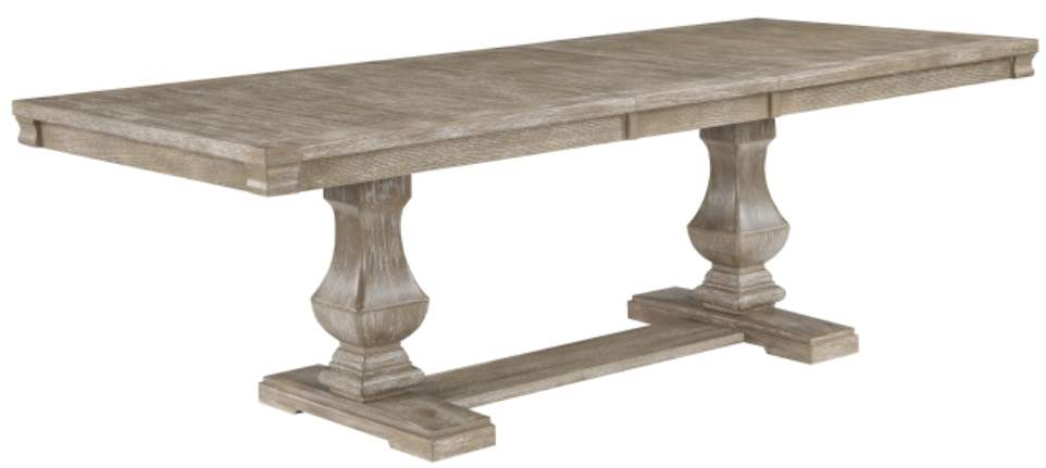 An elegant blend of traditional styling and rustic aesthetic combines to create the look of the Southlake Collection. The rectangular tabletop is supported by a double pedestal base, it’s urn profile lending distinct accent to your dining room. The wire-brushed brownish-gray finish highlights the oak veneer. The collection features solid wood construction.Read More