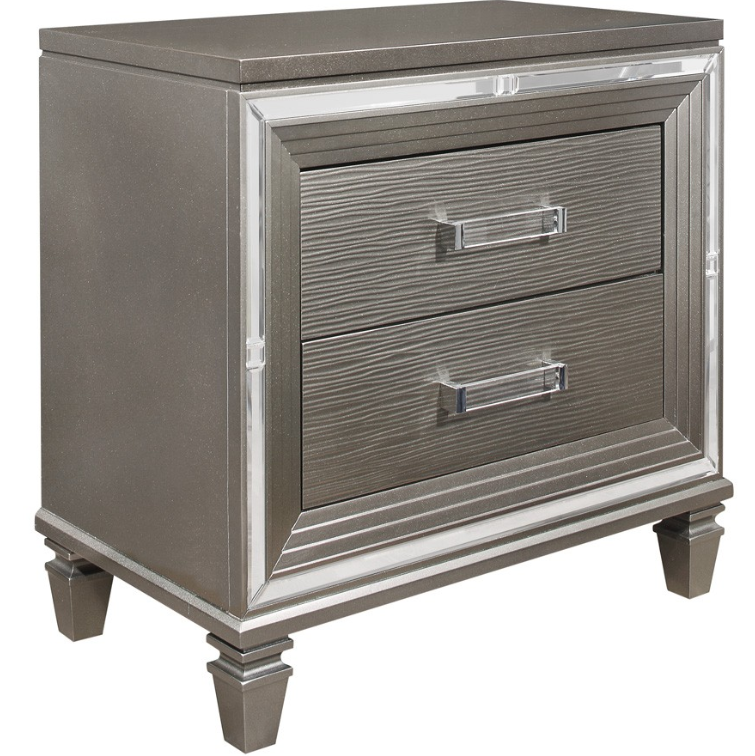 Designed to help your bedroom reach its full glamorous potential, the Tamsin collection’s unique attributes blend to create a stylish and functional addition to your lifestyle. Mirrored framing provides dramatic enhancement to the nightstand, illuminating the silver-gray finish. Acrylic hardware provides unobtrusive decorative touch to the drawer fronts of the nightstand.Read More