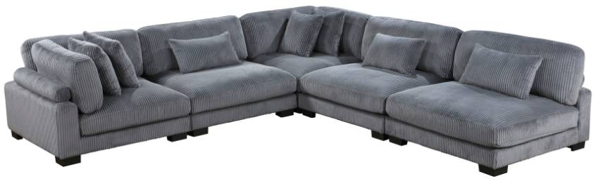 Configurable to your available space, the Traverse Collection allows for the addition and detachment of pieces for a customized seating experience. The 5-piece sectional configuration consists of two corner units paired with three armless chairs. The gray corduroy fabric upholstery creates a plush expanse for a soft touch experience.Read More