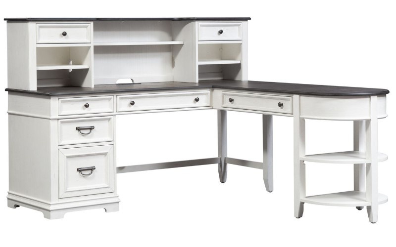Work from home in comfort and style with the Allyson Park L-shaped desk and hutch. Crafted of pine solids with cathedral white oak tops and pine veneers, this piece features a wire brushed white finish with charcoal tops, full extension drawer glides for easy access to storage, one locking file drawer.Read More