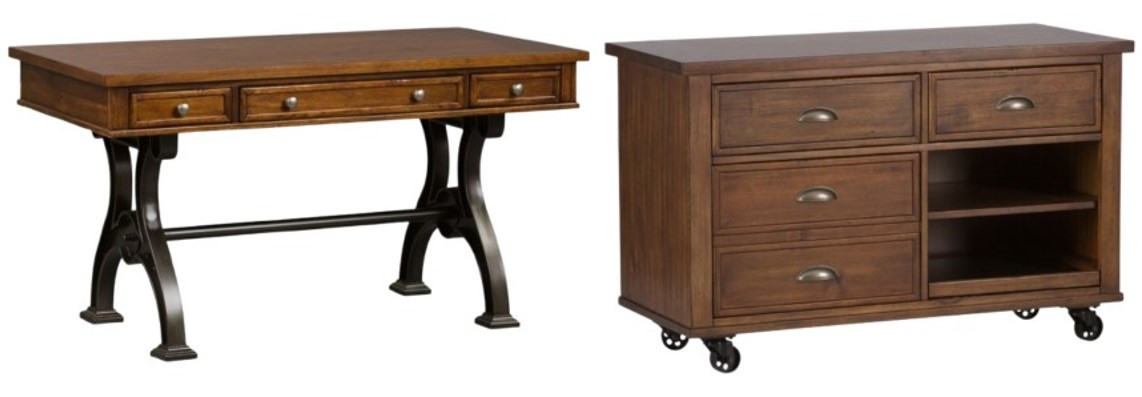 The writing desk features three full extension drawers including a flip down keyboard tray, and a metal industrial style base. The credenza features three full extension drawers including one large file drawer with a bluff-cut drawer front, a pull-out printer shelf, and casters for easy moveability.