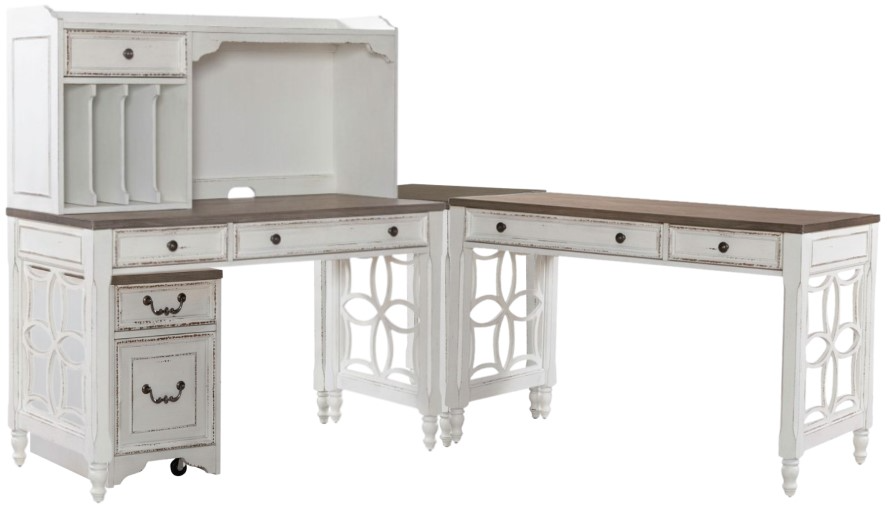 Indulge in the perfect blend of European design with the Magnolia Manor L shaped desk. Crafted of poplar solids with white oak and birch veneers finished in a warm distressed antique white and whitewashed brown top.Read More
