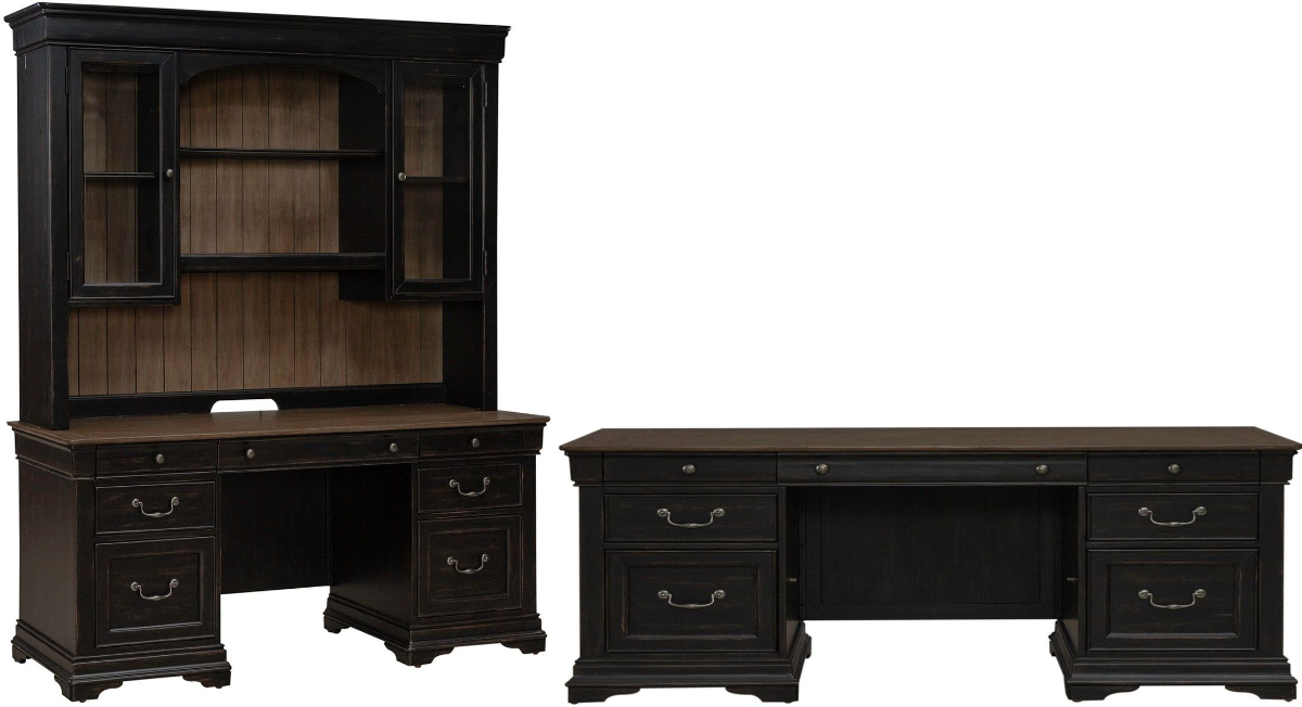 The jr. executive desk and credenza each have 7 drawers with wood-framed fronts. Each drawer is designed to provide ample storage space while exuding timeless charm. Among these, two locking file storage drawers offer added security and organization for your important documents. Also included is a flip down keyboard drawer offering a seamless solution for your typing needs while ensuring efficient wire management. Illuminate your work area with ease, thanks to the touch LED and task lighting integrated into the hutch. Whether you're burning the midnight oil or tackling deadlines during the day, this lighting solution ensures optimal visibility for enhanced productivity. Adorned with two wood-framed glass doors, accented with Antique Pewter knob hardware, this credenza hutch exudes timeless elegance. Behind each door, discover a wealth of storage options with one adjustable wood-framed glass shelf, allowing you to showcase your prized possessions or keep essential items within easy reach. In the center, against a striking planked back panel in the Carmel finish, rests an open adjustable wood-framed glass shelf. This contrasting feature not only adds visual interest but also provides additional storage space for your convenience. With wire management provisions discreetly integrated into the design, you can bid farewell to cluttered cables and tangled wires, keeping your workspace neat and always organized.