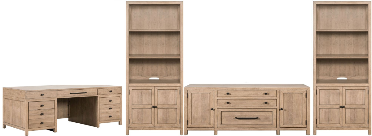 Set includes: Jr Executive Desk (Top and Base), Credenza, and 2 Bunching Bookcases