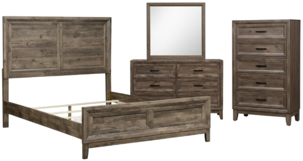Enhance your home with the Ridgecrest queen panel bed, dresser, mirror, and chest. Crafted of rubberwood solids with paper laminate, this kit features a cobblestone finish, picture frame cases, tapered feet, drawer fronts with canted moldings, paper laminate drawer interiors, and is accented with antique brass bar pull hardware.Read More