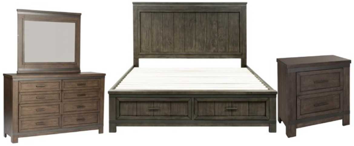 Elevate your home with the Thornwood Hills king storage bed, dresser, mirror, and nightstand. Crafted of rubberwood solids with mango veneers, this kit features a rock beaten grey finish with saw cuts, straight line cases with wide pilasters and block feet, metal strip accents.Read More