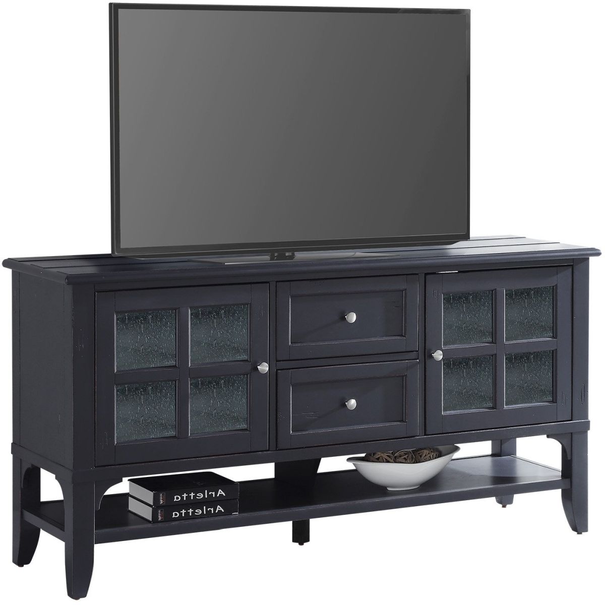 Offering classic design and modern functionality, this TV console in Vintage Navy with planked detailing is destined to be a focal point of the room. It features lattice wood doors with glass panels on each side of the cabinet.Read More