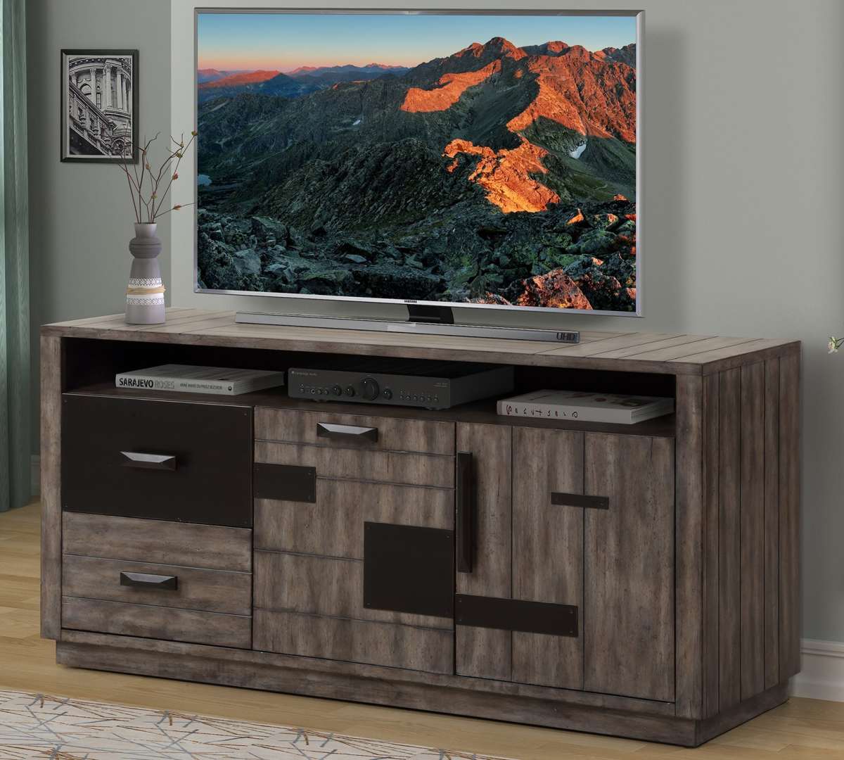 With bold styling and a stunning finish, the 63-inch TV Console from the River Rock collection is destined to be a focal point in any room. Inspired by the beauty of the great outdoors, it features an exquisite hand-applied, multi-step finish in Siltstone accented with iron-inspired accents. Multiple storage drawers and areas ensure plenty of room for your games, movies and electronics while an open center compartment is designed for today's components.