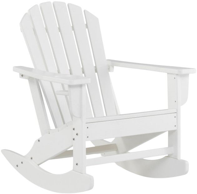 Add cottage-quaint charm to your outdoor oasis with this rocking chair in white. Made of MEGA TUFF™ high-density polyethylene material, it’s sure to weather the seasons beautifully. Designed to shed rainwater, the chair’s slatted styling and classic Adirondack design provide exceptional form and function.Read More