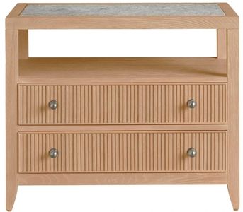 The Carmen two-drawer nightstand is a stylish and functional addition to any bedroom. Its two spacious drawers, adorned with sleek metal ring pulls, offer ample storage for bedside essentials. The open shelf, accented by an inset stone top, adds a touch of luxury and provides a convenient space for displaying books or decorative objects.Read More