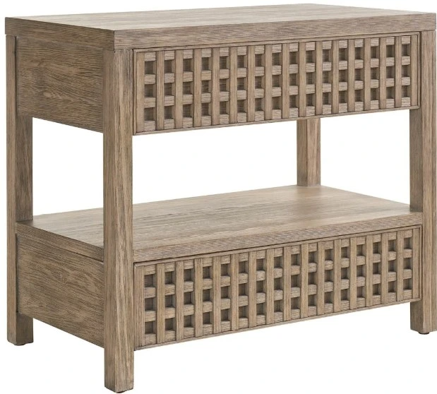The boulder nightstand showcases the collection's architectural inspiration with its distinct latticework detailing, finished in a warm boulder medium-brown. This piece offers both open and drawer storage, combining functionality with a touch of sophisticated design. Its unique texture and clean lines bring a refined, yet natural aesthetic to your bedside.Read More