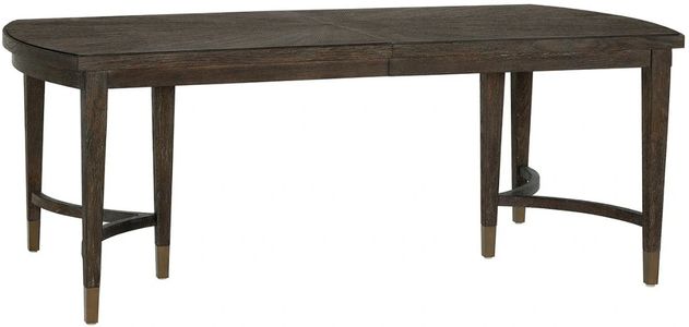 The cocoa dining table showcases exceptional craftsmanship with rectangular form, gracefully rounded ends, and beautiful radial match veneer. The distinctive triple pedestal leg configuration with smoked gold metal ferrules creates airy elegance, while two 18-inch leaves accommodate both intimate and larger gatherings.Read More