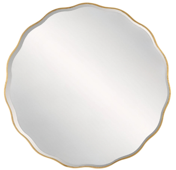 Showcasing an impressive scale and a feminine scalloped edge, this shaped wood mirror adds whimsical flair to any design. The mirror is finished in aged gold and has a 1" bevel.Read More