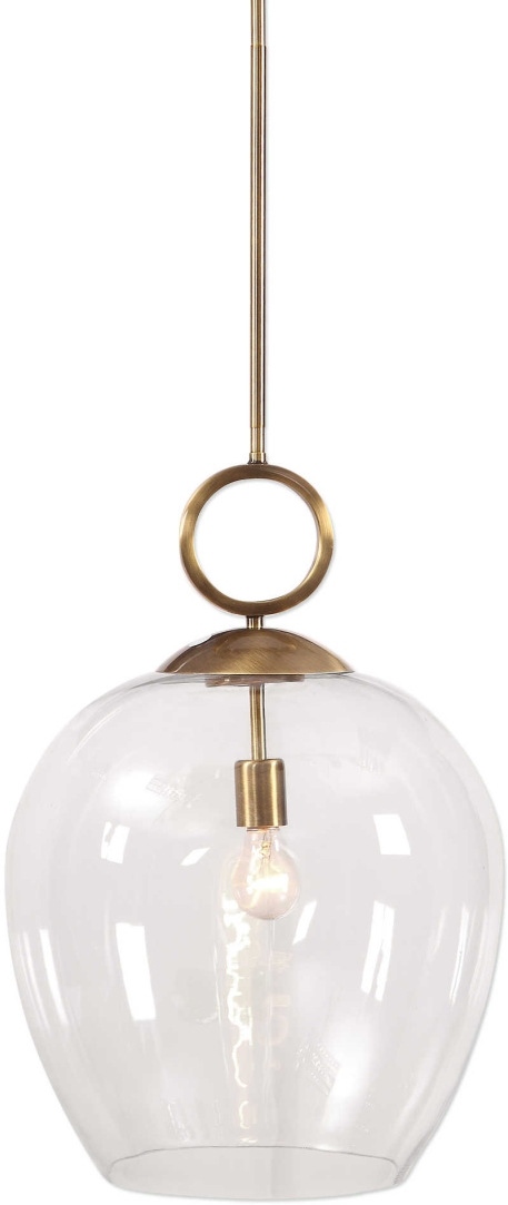 Simple Elegance Best Describes The Extra-large Clear Blown Glass On This Transitional Pendant. Features An Aged Brass Metal Finish Which Has An Ombre Effect Giving A Deeper Hue Of Antique Darkening To Some Areas And Brightening On Others. The Large Circle Accent Above The Glass Adds A Bold Graphic Element.