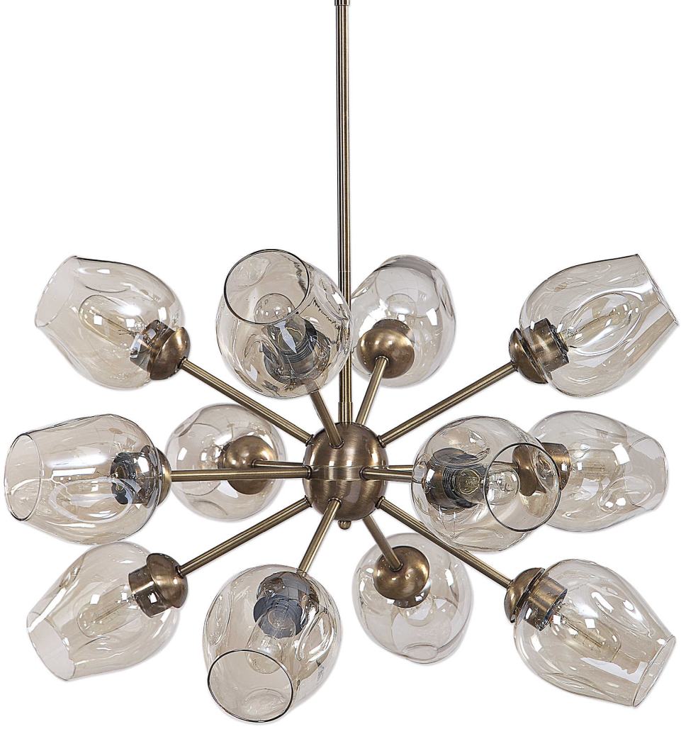 Transitional With A Flair Of Mid Century Sputnik Style, Our 12 Lt. Rod Hung Chandelier, Features A Warm Antique Brass Finish With Plated Amber Dimpled Glass Shades. 12-60 Watt Max Edison Sockets And Includes 12-40 Watt Clear T45 Bulbs. Supplied With 15'wire, And 3-12"stems & 1-6" Stem For Adjustable Installation.Read More